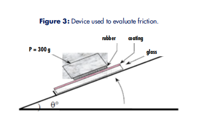 圖3所示的一個非常簡單的裝置用于評估涂層表面的滑動性。將300g橡膠鞋底(6x6 cm)置于紫外線固化膜上。然后逐漸傾斜樣品,直到開始向下移動,并測量角度θ。角度越大,表面就越不光滑。配方F0的角度約為30°。超細聚酰胺12或共聚酰胺6/12粉末的加入使角度降低到25°。二氧化硅濃度為10%時,角度下降到18°。二氧化硅材料的性能與超細聚酰胺粉末不同。